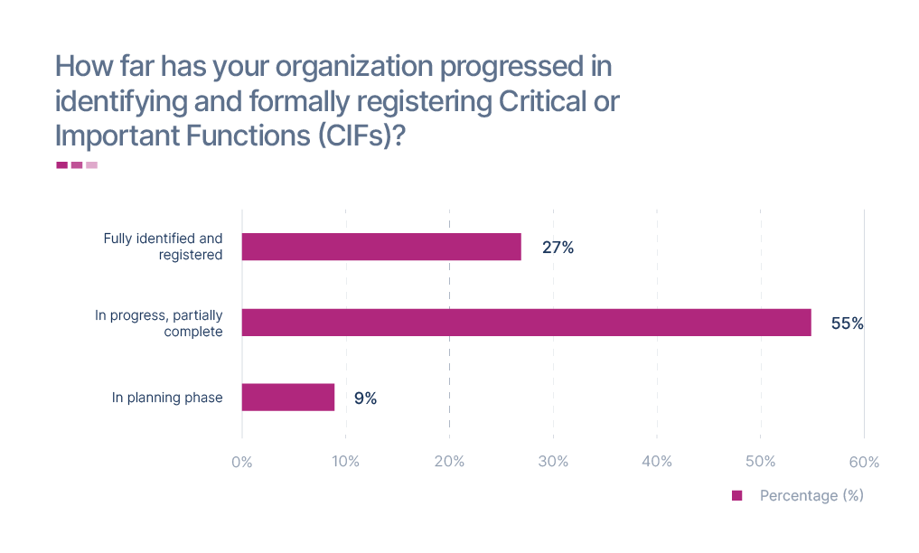 The benchmark shows that many organizations are still in the early stages of defining their critical functions. While a portion of organizations report that they have fully identified and registered their Critical or Important Functions, the majority are still in progress. A smaller group remains in the planning phase, indicating that even foundational steps are not yet complete across the board.