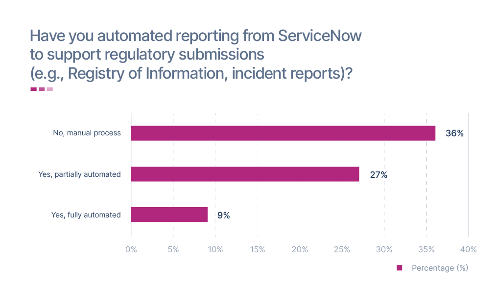 Another key finding is the continued reliance on manual processes for regulatory reporting. Even among organizations that use platforms like ServiceNow, many still generate reports manually. This includes critical outputs such as incident reporting and the Register of Information.