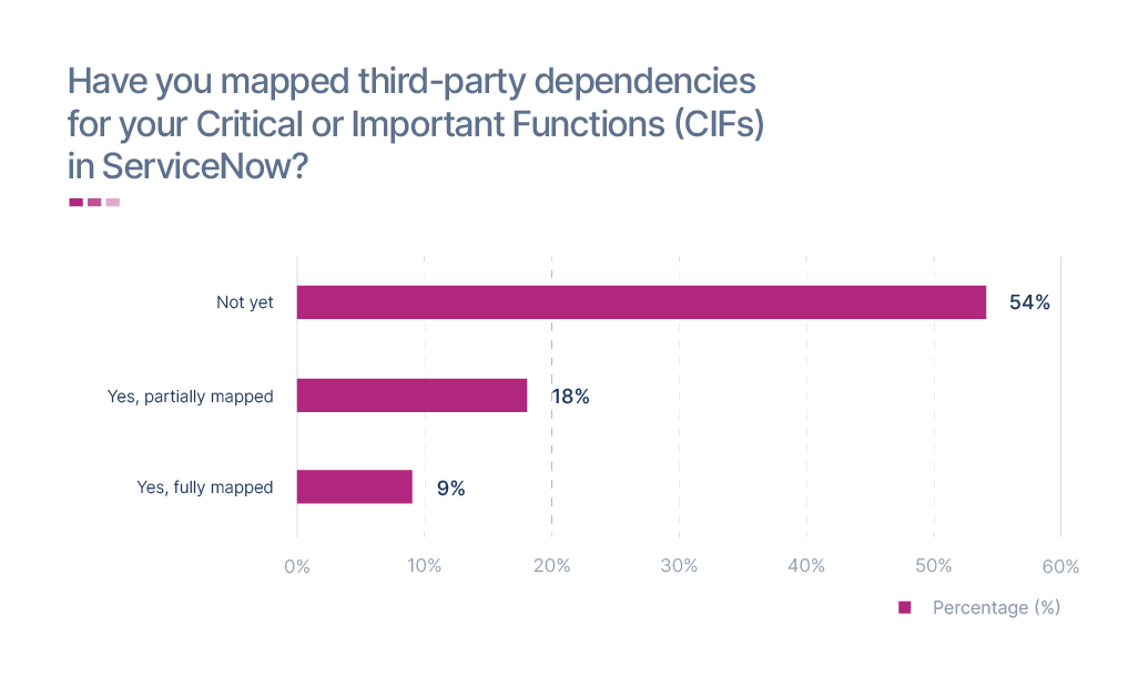 One of the most significant gaps identified in the benchmark relates to third-party dependencies. A large share of organizations report that they have not yet mapped how vendors support their critical functions. Only a small percentage have achieved full visibility in this area, while others are still working toward partial mapping.